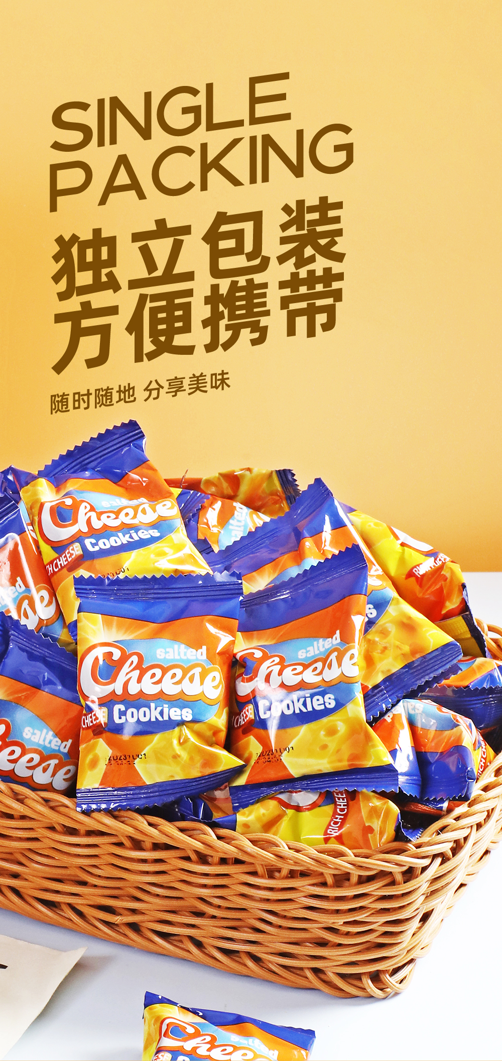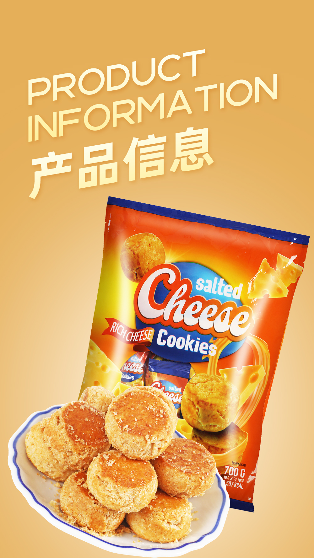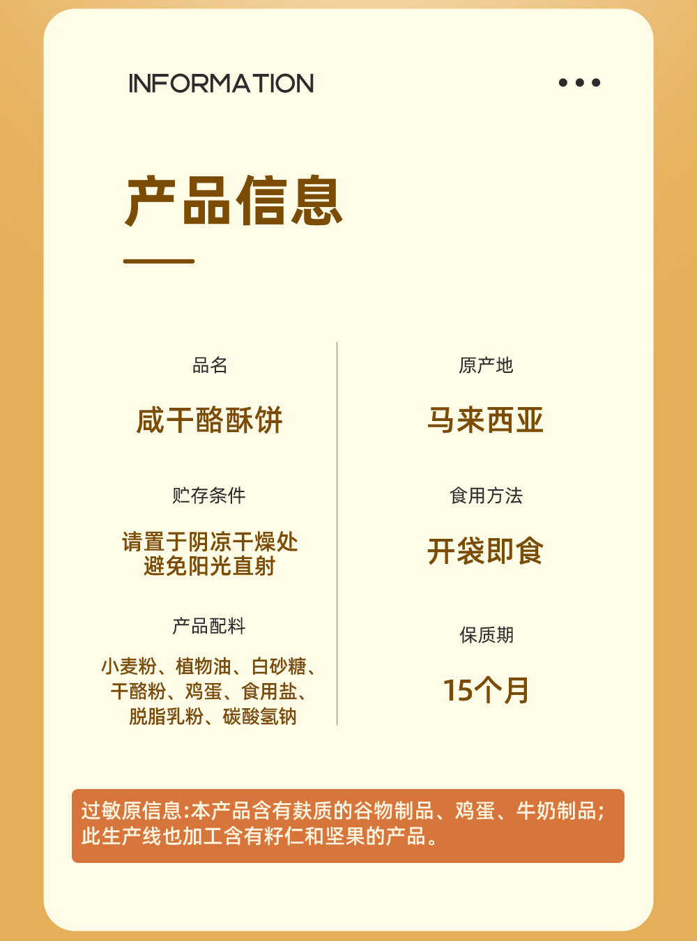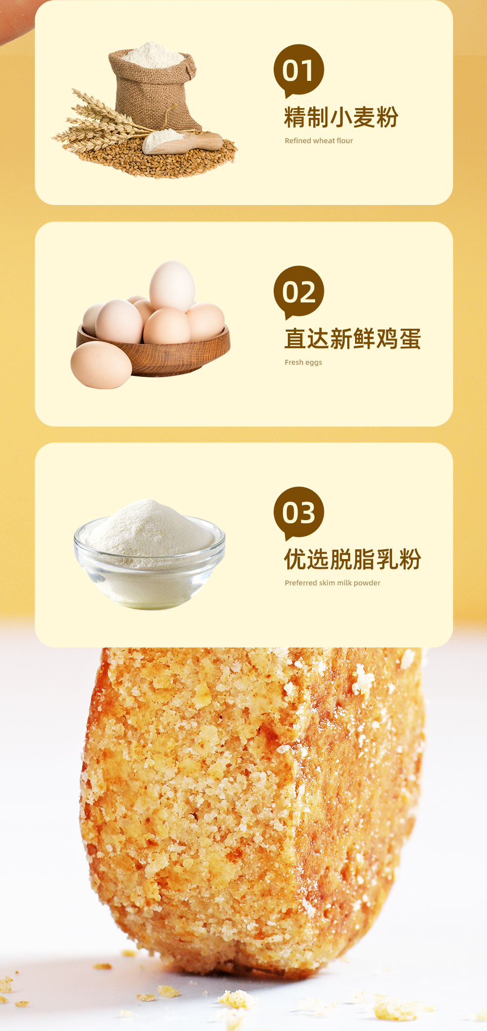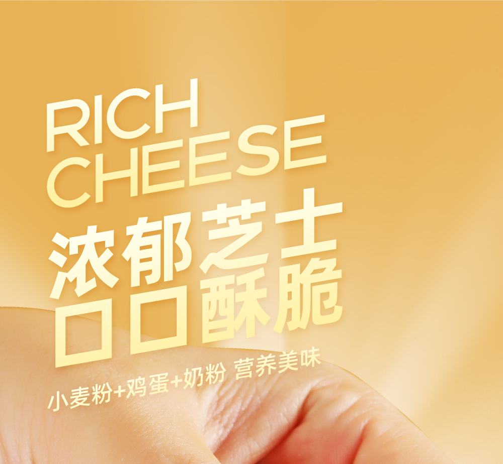 小麥粉、植物油、白砂糖、干酪粉、雞蛋、 食用鹽、脫脂乳粉、碳酸氫鈉。